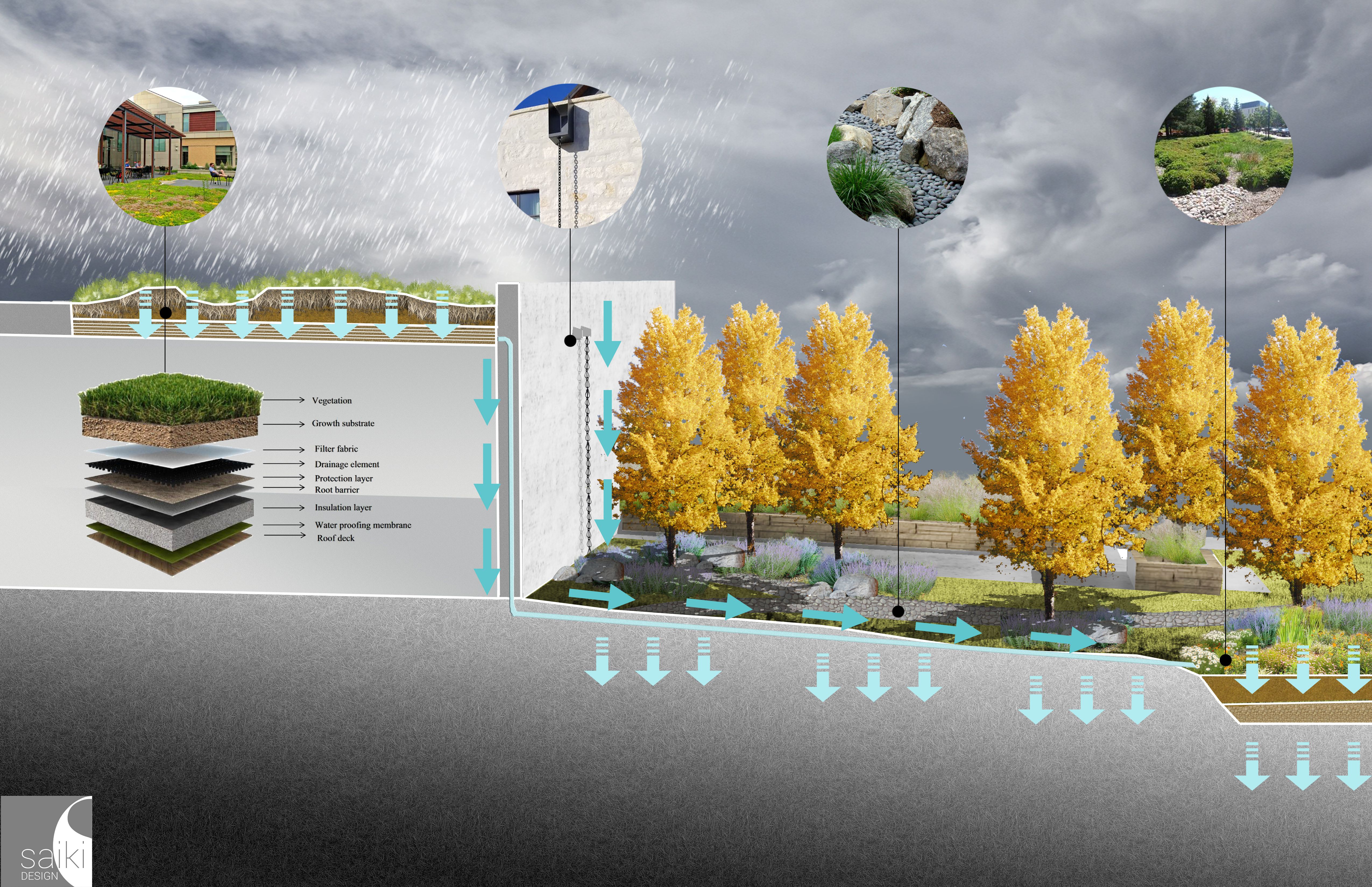 Integrated stormwater management was an initial design theme that resulted in broad, site-wide movements created by sweeps of plantings, paving and landscape materials. Green roofs provide the initial stage of stormwater capture and treatment and connect to cobble streambeds and planted depressions that crisscross the site, weaving their way through a protected alcove in the building’s layout that harbors a number of smaller patios and seating areas. Infiltration basins terminate the stormwater capture sequence and visually connect the organization’s ethic of environmental stewardship to the entry and arrival sequence to the site and building.